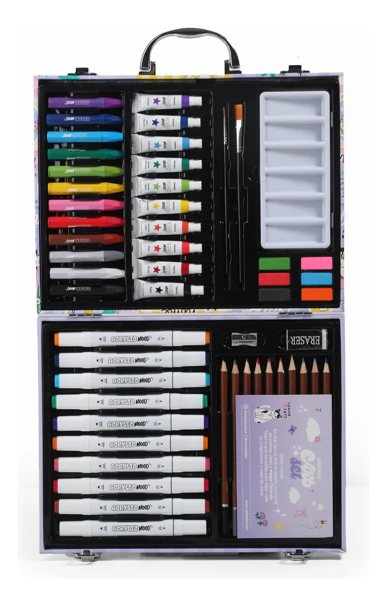 El arte se vuelve una aventura mágica con el nuevo Set de Arte Chimola, una propuesta colorida y funcional pensada para estimular la creatividad desde el primer trazo. Presentado en un estuche tipo valija con diseño full color e ilustraciones, este set se convierte en el compañero ideal para dibujar, pintar o hacer manualidades en casa o en la escuela. Su estructura rígida con manija y cierres metálicos de seguridad garantiza resistencia y practicidad, mientras que su interior refleja el inconfundible estilo Chimola, incluyendo una postal ilustrada de regalo.