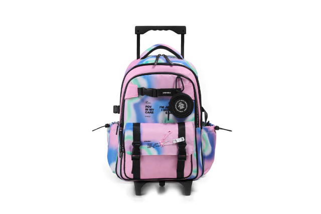 Esta mochila en su versión carro tiene estilo propio por sus colores en efecto blureado. Su pouch colgante desmontable no solo es práctico para guardar lo que quieras sino que también le da un toque único. Incluye pins decorativos que podés mover y combinar para personalizar tu mochila como más te guste. Con tres compartimientos amplios y un bolsillo frontal, vas a tener espacio de sobra para organizar cuadernos, carpetas y accesorios.